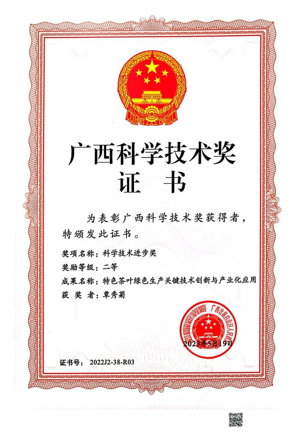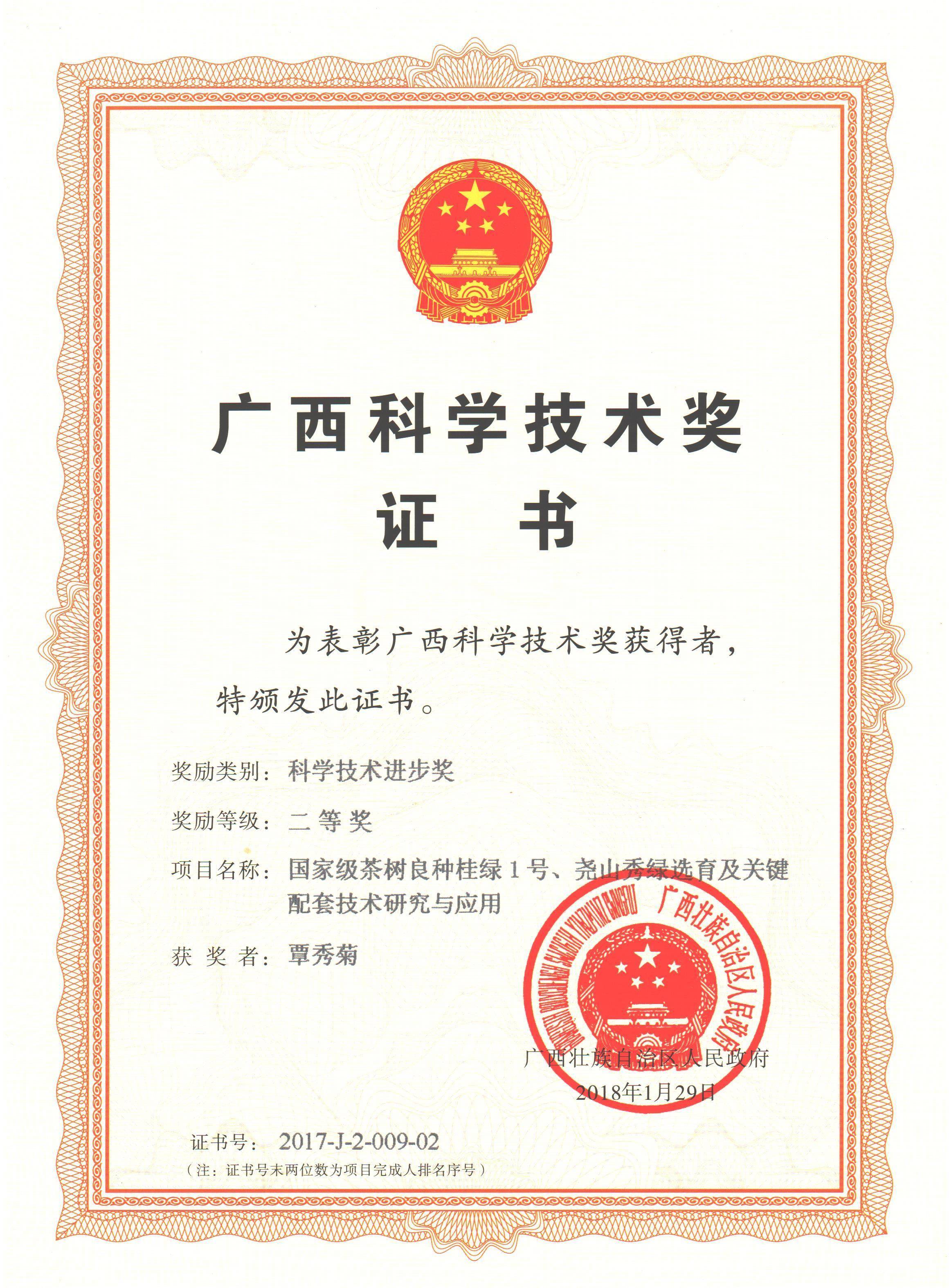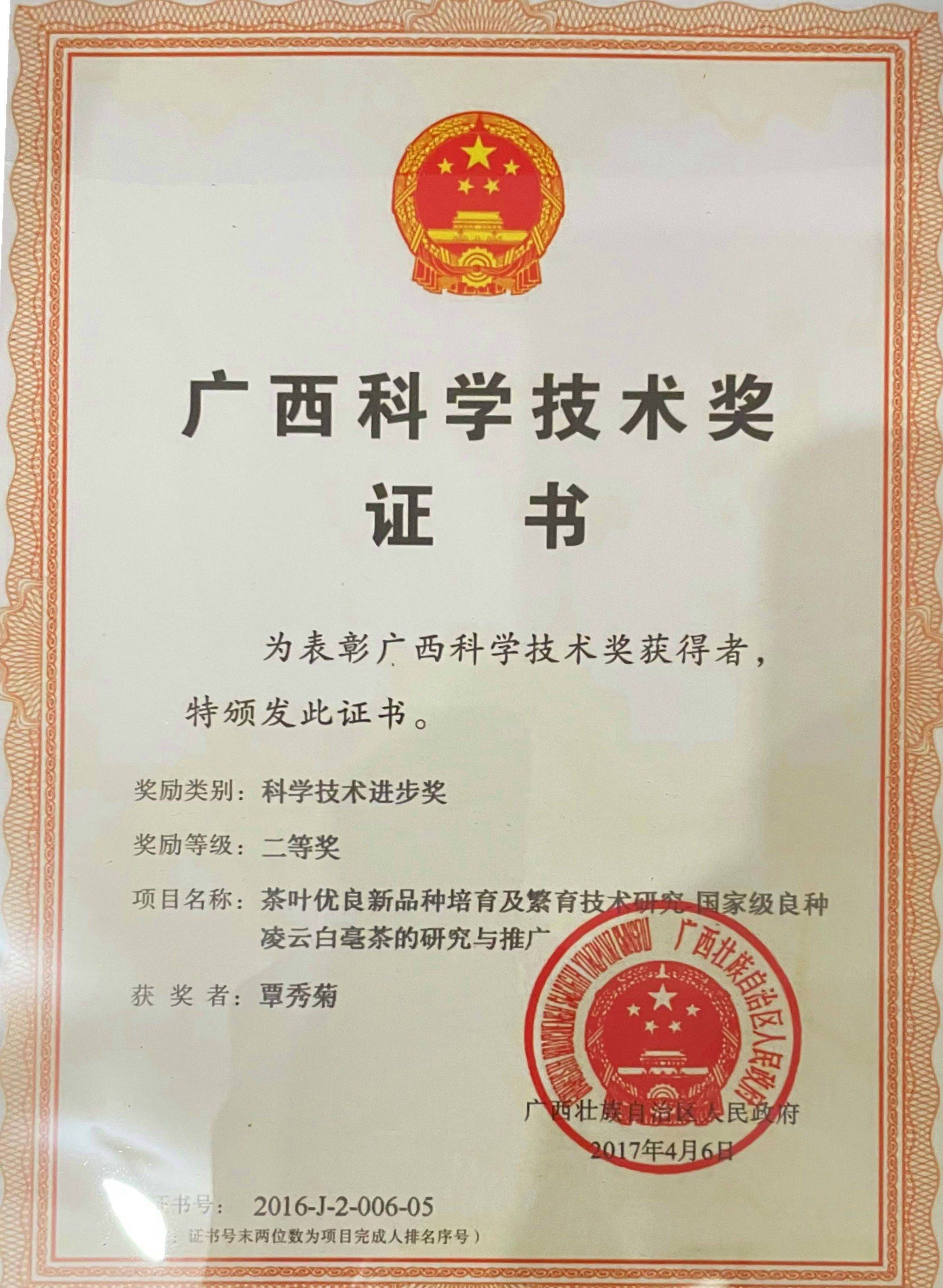 在广西茶叶科学研究所和广西绿异茶树良种研究院的茶树种质资源圃里,覃秀菊曾主持和参加收集选育 1900 多份茶树种质资源。从广西茶叶科学研究所科研科科长、品种研究室主任到广西绿异茶树良种研究院院长,这位手握 51 项荣誉的全国百名“杰出中华茶人”,用 90 多项科研项目、12 个国家级茶树良种证书,在八桂大地写下茶科传奇 —— 她与团队培育的“尧山秀绿”、 “桂绿1号”品种及创新配套技术等获广西科技进步二等奖和广西农牧渔业丰收奖一等奖,指导繁育的 3 亿多株茶苗让8万多亩茶园焕发生机,更让56个贫困村通过种茶走上致富路。