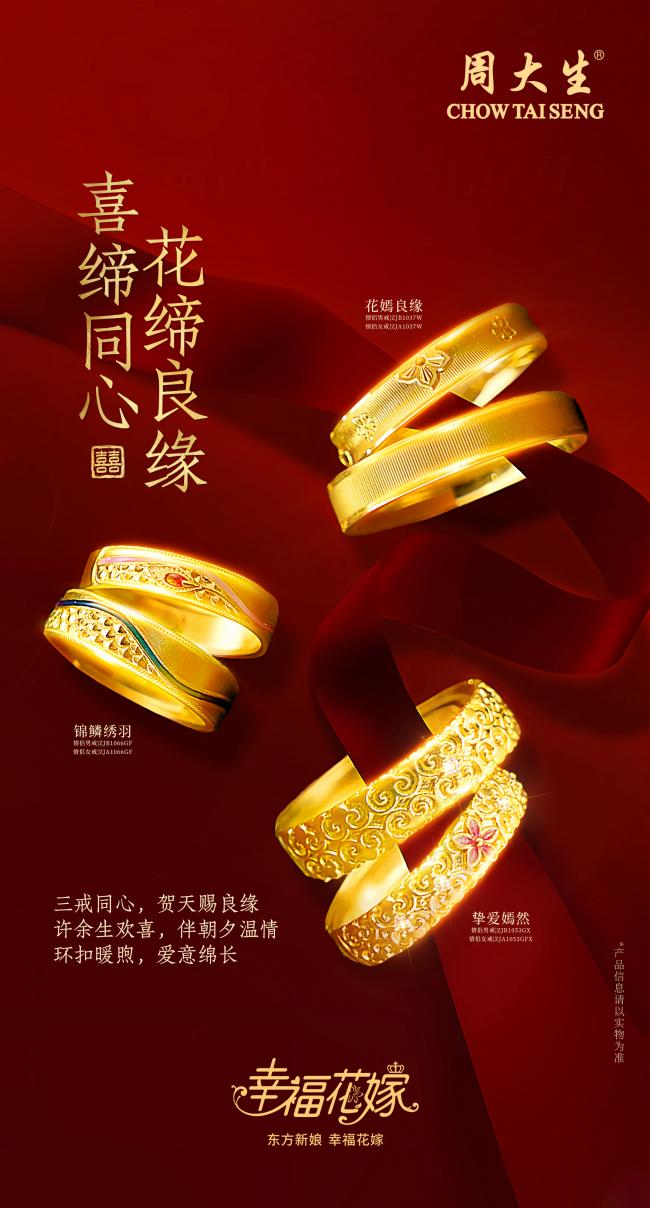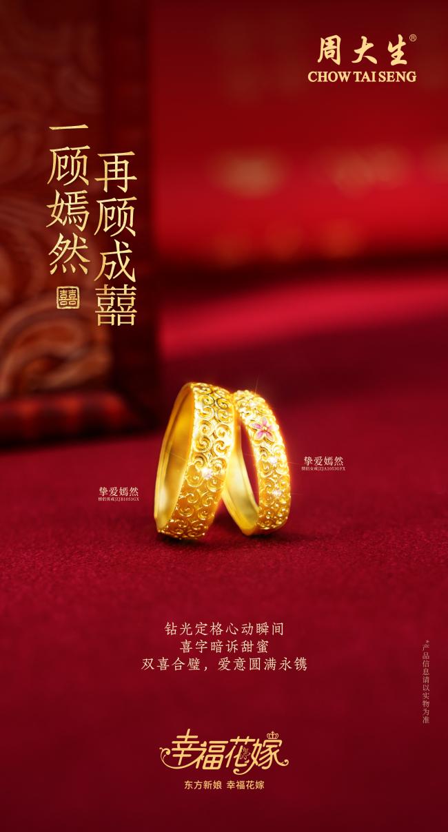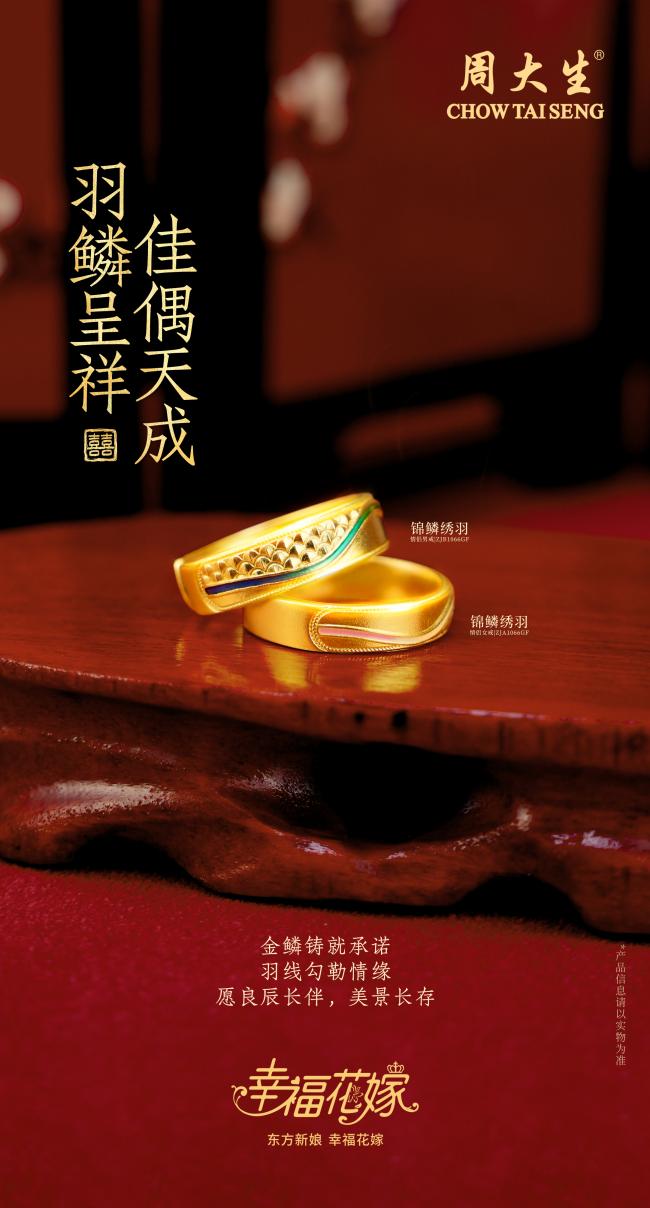 三戒同心,贺天赐良缘,周大生珠宝幸福花嫁系列将东方婚嫁之美娓娓道来。“锦鳞绣羽”取龙凤之形,贺天作之合;“花嫣良缘”融自然之韵,许岁月温情;“挚爱嫣然”凝双喜之美,伴此生之约。三戒各异,一脉相承,皆为东方婚嫁文化在当代的深情回响。愿每一对璧人,执手时有戒为证,相守时有诺可依,此生相合,岁月为鉴。